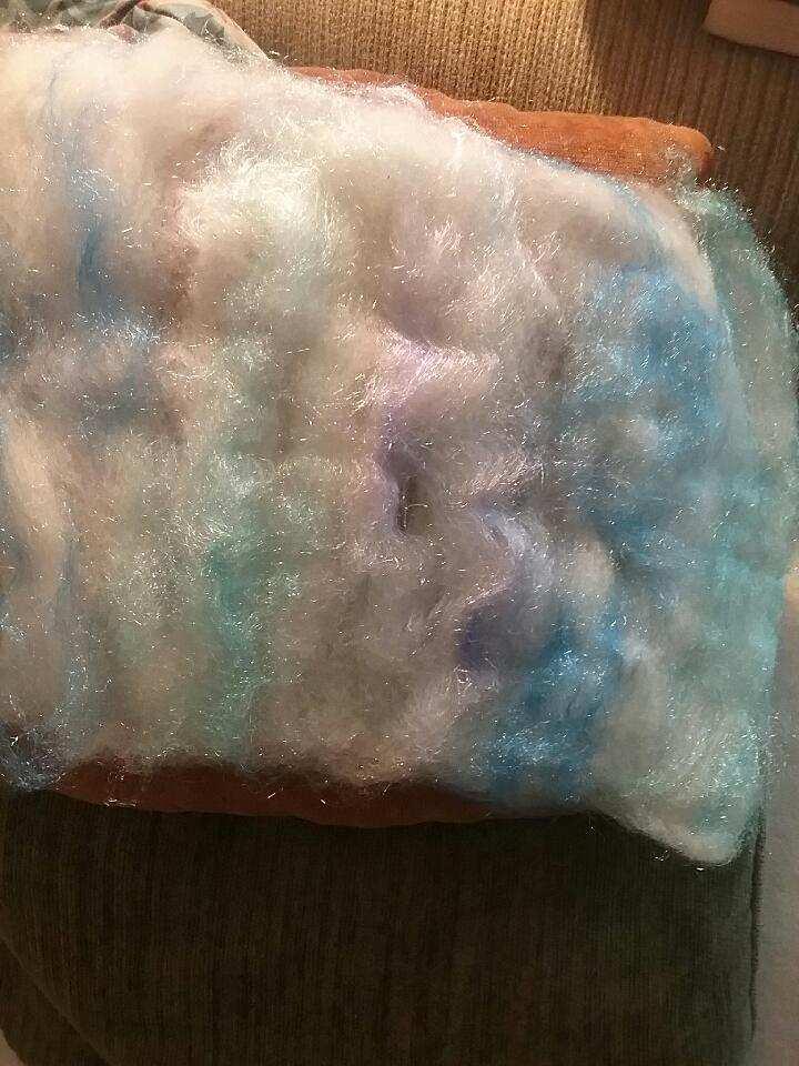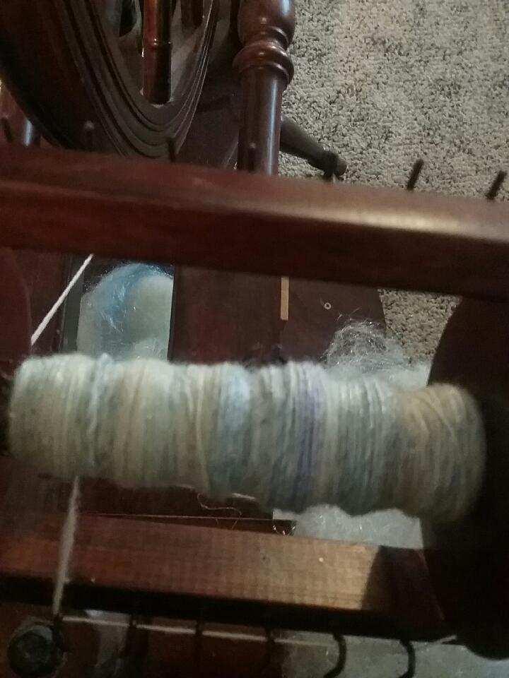I am doing a spin-a-long for the Tour De Fleece (take off of the Tour De France race). I am spinning with Fiber Love Diary on youtube. She has a great spinning and dying podcast. The first picture is one of the two batts I made on my blending board with Polypay and some firestar I dyed. I think I put a little too much firestar in LOL, but it’s a learning experience right? I still have to put this 2nd batt on the blending board for one more pass. This was day two, sorry no picture of day 1. I won’t be posting everyday but I will when I get the first bobbin done, then the second and then after plying before I start on another batt or roving :). This is going on for 3 weeks and I’m spinning about 20 min a day, well maybe 30 :P, except we take a break on the days the bicyclists aren’t riding.