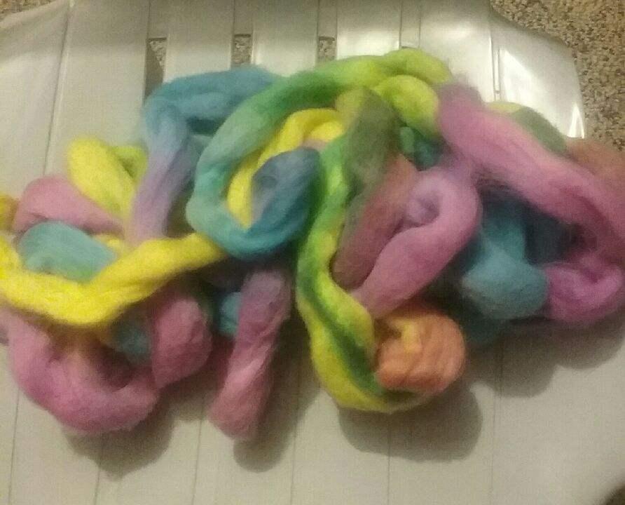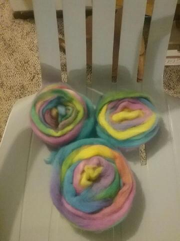 The picture on the left is the 1st bobbin for the 2nd skein of yarn, and I finished it before the end of the Tour de Fleece. The 2nd picture is the roving I will be spinning for the 2nd bobbin and because I have separated it into 3 lengths the colors will be shorter when I spin them and that will make this a fractal spin with the first bobbin having all the colors one after the other and the 2nd bobbin having the same colors repeating 3 times and then plying them together. this is only my 2nd fractal spin, interested in how it will turn out.