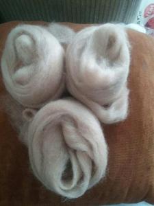 The next two pictures are the alpaca cria (baby alpaca) roving I am spinning on my Rick Reeves double drive wheel. The alpaca fiber is butter soft as it goes through my fingers, and oh my it almost spins itself!! This roving was from a cria fleece that my daughter bought me a few years back that I had sent off to a mill in the east to turn into roving and they did a tremendous job!!