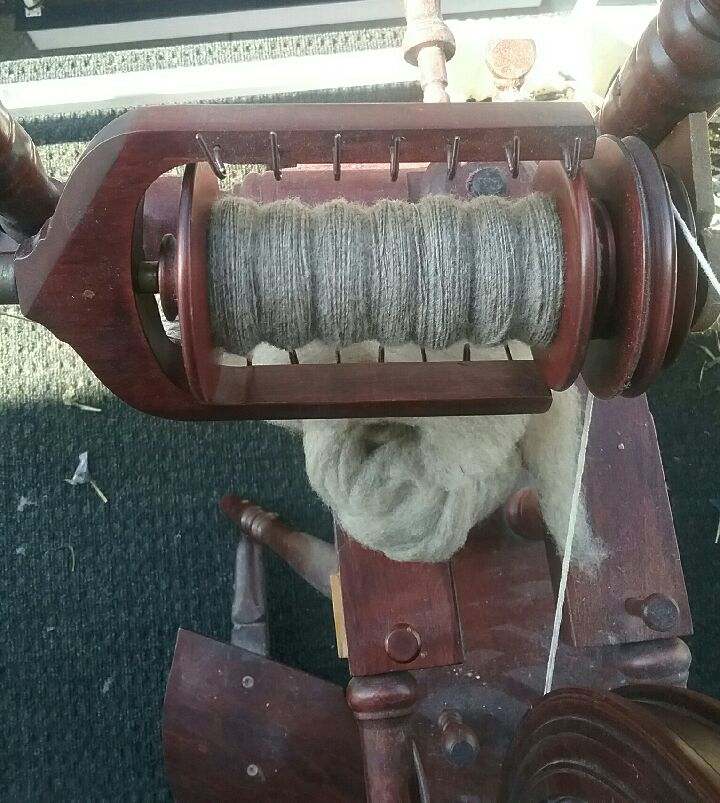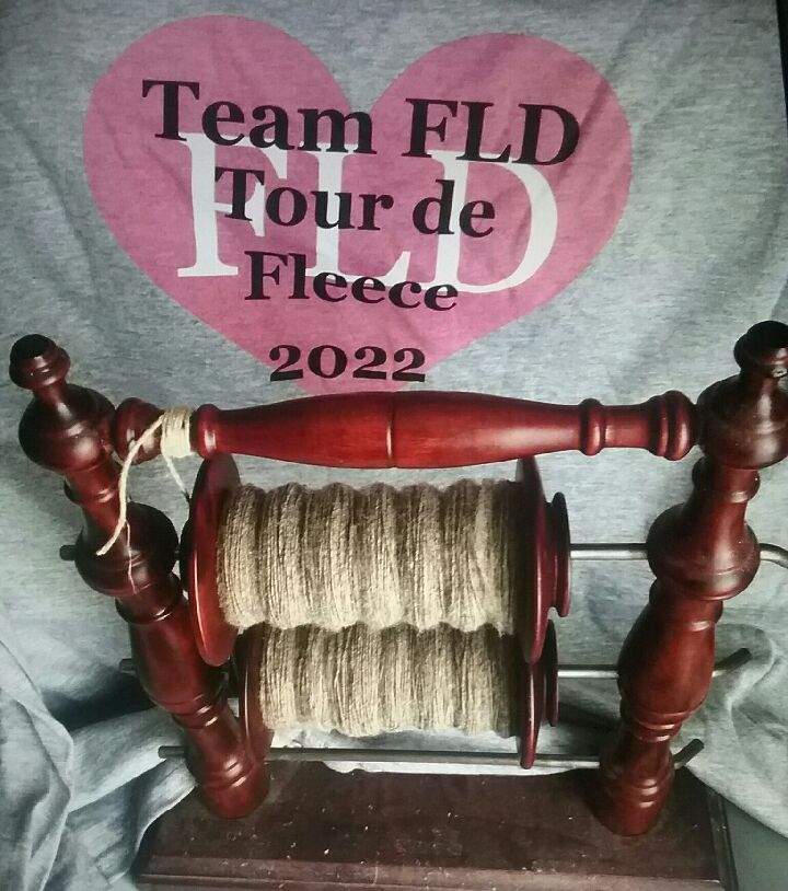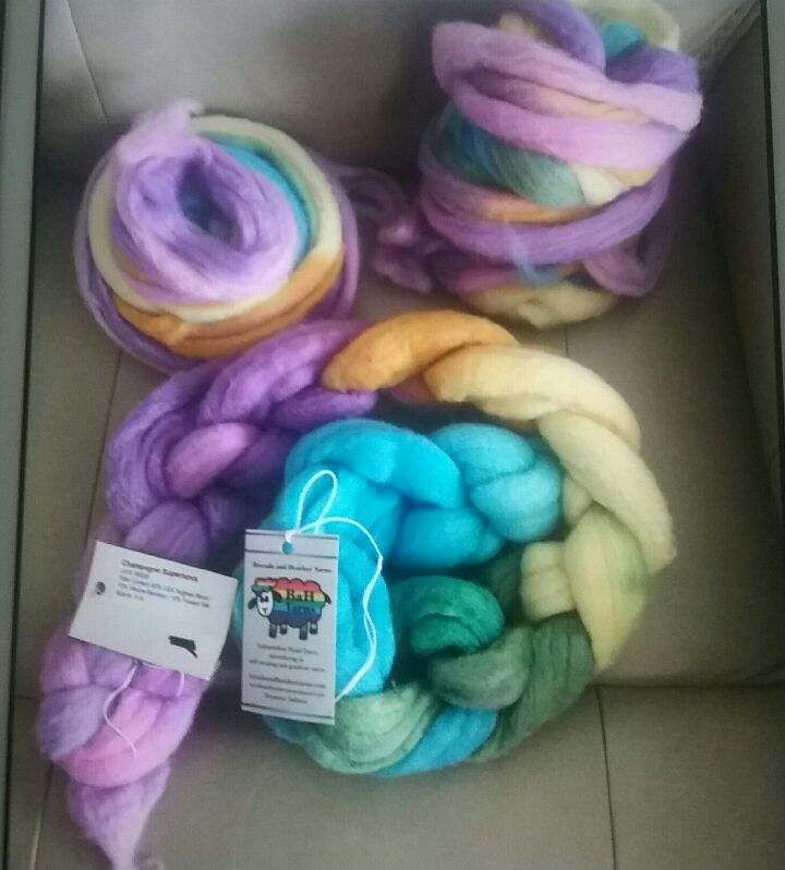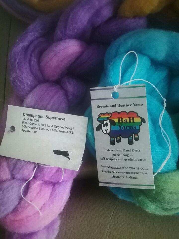 This is my new spin. It will be a fractal. The full braid is a 2nd braid in that color I had just to show you the braid before I split it to spin. The braid I’m using (Targhee wool/Bamboo/Tussah silk) is split in half (back left), then the other half is split into thirds (back right stacked on top of each other). They are all spun end to end on their respective bobbin, that way the ones split into thirds will be shorter in color length, and will be plyed with the half on the first bobbin where the colors will be longer. It’s an interesting spin :). Some of the colors will end up plying with the same color and others will be mixed up and look like barber poles. I took a picture of the tag on the braid of fiber, it is a deep stash pull. The fiber dyer is still around you can find them at Brenda and Heather Yarns .