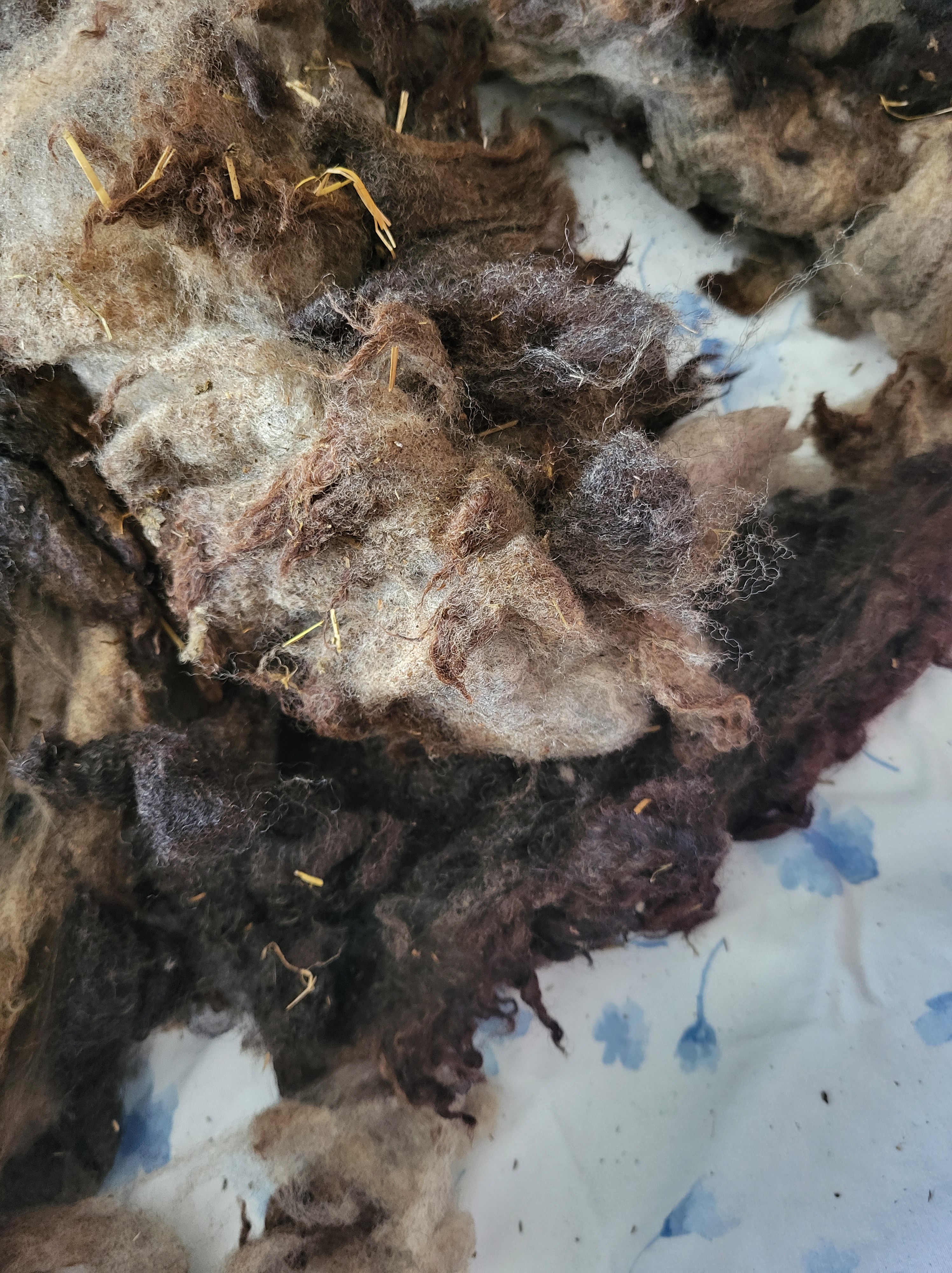 I signed up last spring to have two fleeces that I have had for about 4 years turned into roving to spin, and I needed to ship them to the mill around Aug 1st. I tried to skirt them in April but rain and wind made it not fun to try to do outside, so I put it off. Now it’s too hot so I decided to do these on a sheet in my living room. They made a nice sheepy smell in my living room lol. I did the white fleece today, and the grey yesterday. These were very dirty fleeces and I lost about about 1/3 of them to parts that were so dirty they were past cleaning up. These were not coated sheep because are meat sheep, however they were polypay ewes and their fleece is next to skin soft. They were given to me so I’m not out any money and I will have some nice fiber to spin when they come back from the mill.