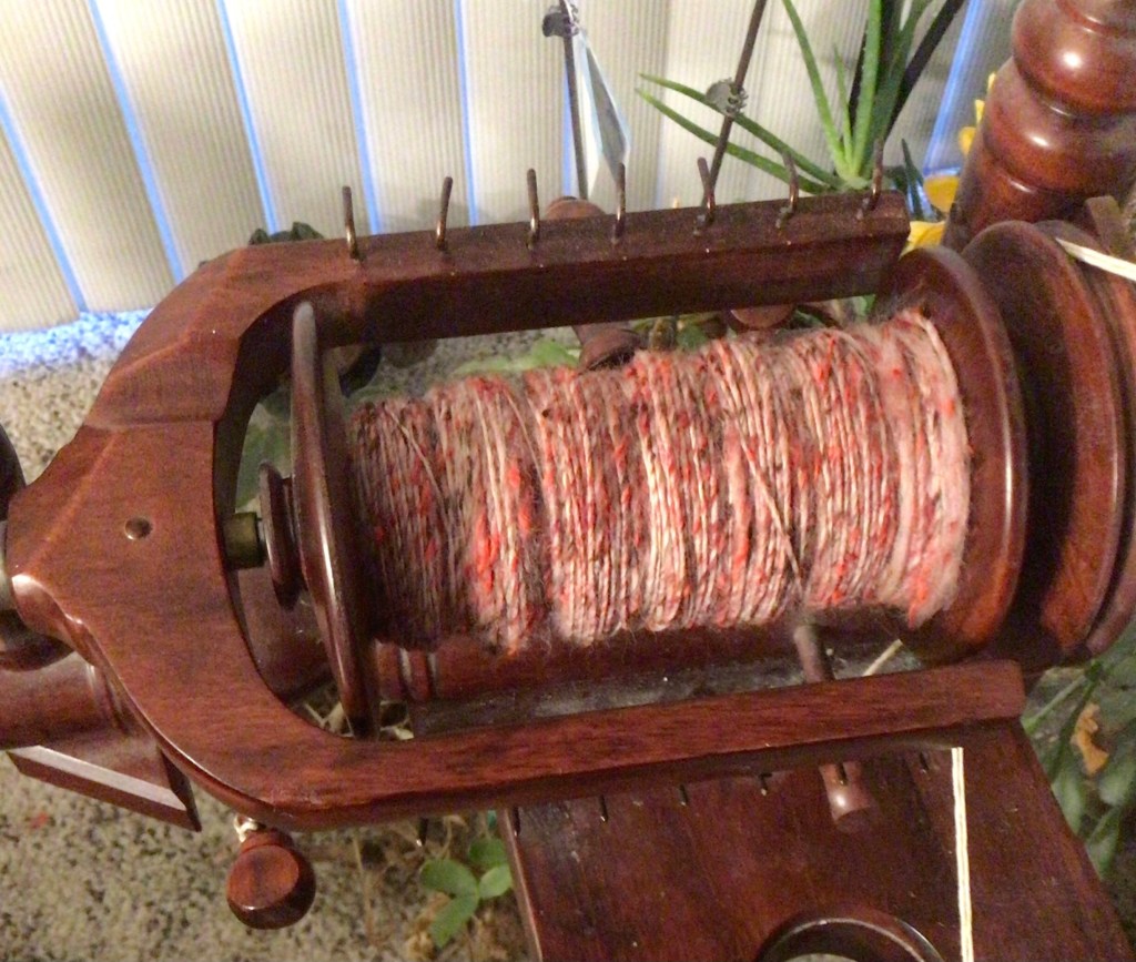 Finished the skein of the tweed fiber called Very Berry Color Pop, it is South American Wool & Viscose bits Blend combed top by Camaj Fiber Arts , I have added a link to this fiber but it’s for 1lb of fiber for a pre-order. Her pre-orders are usually a very good price because she’s pre-ordering bulk. I got mine when it was available in 4 oz quantities. She has a lot of nice fiber. This skein apparently turned out to be a bulky, it is 138 yards, 4.25 oz. Wonder if there is enough for a hat?