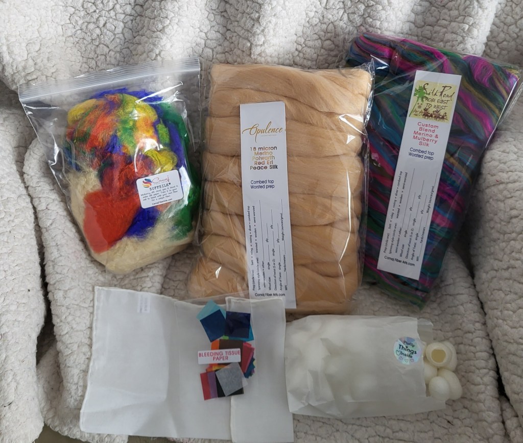 A few weeks ago I entered in a giveaway from Camaj Fiber Arts for a spinning box. She prepares these and sells them once a month, they are a surprise box of fiber, and always worth it. I entered and she was giving away 3 and I thought well, maybe! I got an email a little over a week ago and I won one of them!!! This one was titled Silk Road from East to West. It’s all about silk, some gorgeous spinning fibers in it! The light colored package of roving is Opulence, 18 micron Merino and Polwarth and Red Eri Peace Silk combed top, and this is soft, soft, soft! The colorful package the same size is Merino and Mulberry silk combed top, and it is oh so soft! The smaller bag of colorful fiber is Soffsilk, a cloud of various colors of dyed mulberry silk. It will be nice for blending on my drum carder with other fibers for color and texture :). Then there is a silk handkerchief with some bleeding tissue paper to make a dyed silk hanky :), should be fun. The last thing is a sack of some Eri Peace Silk cocoons. I’ll have to check out more about degumming them, tho the paper said I could also dye them and string them for my Christmas tree and actually I have a small fiber optic tree so it might actually look very cool :P. This box arrived on Saturday and my birthday was yesterday, what a coincidence was that!!! What a wonderful birthday gift! I like buying fiber from this fiber arts online store, they have a great variety of fiber and fiber tools and some great prices :).