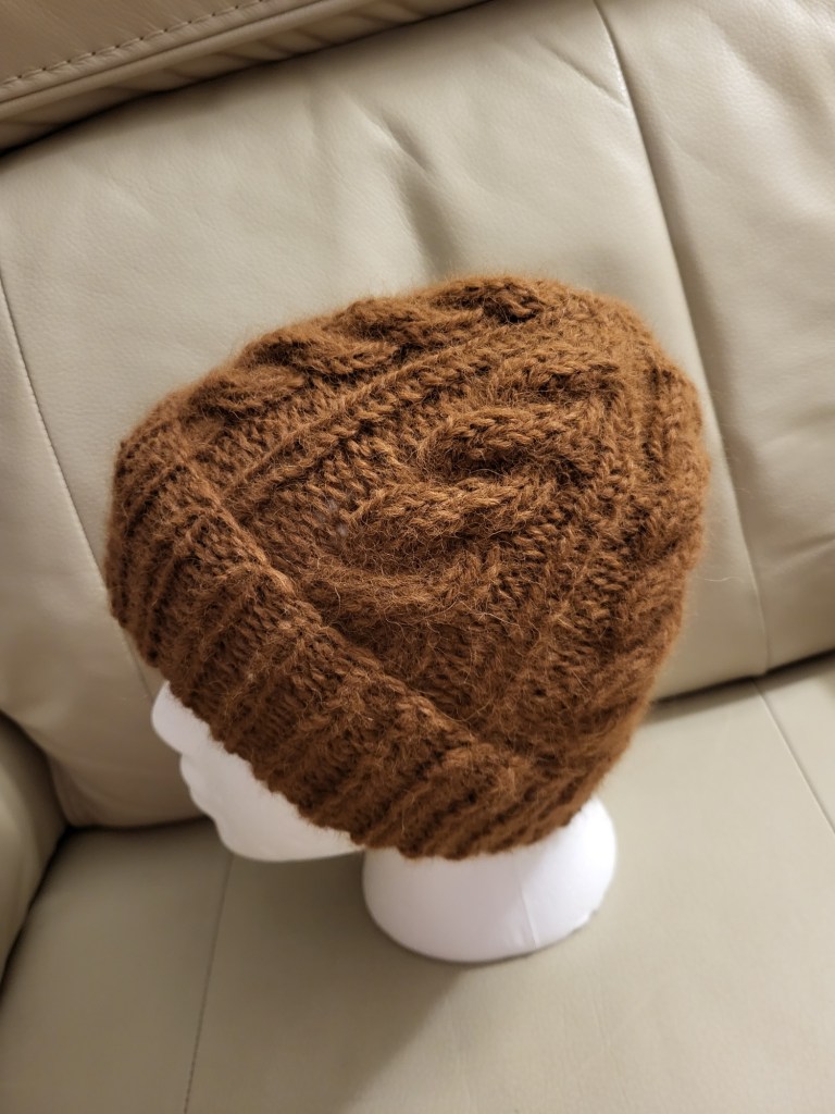 The last picture is the FO. This is the Classic Cables Hat and Mittens by Destiny Meyer pattern, (I only knit the hat) that I was getting ready to start, link to my post on this. It fit Ev, but because the size for this was for a woman’s medium and I was knitting this for a man I used the larger needle size that it mentioned in the needles section for a larger or slouchy hat and added an extra cable vertically to make it a little longer. Also if I make this for him again, I will also add about 1 & 1/2 inches to the cuff so it will sit well below his ears when it’s folded up, men have larger heads than women ;P, he said it was fine the way it was, but I like things to be better than fine :P. A link to her shop can be found here, this pattern is on sale on this page of her patterns, but I don’t know how long the sale lasts :).