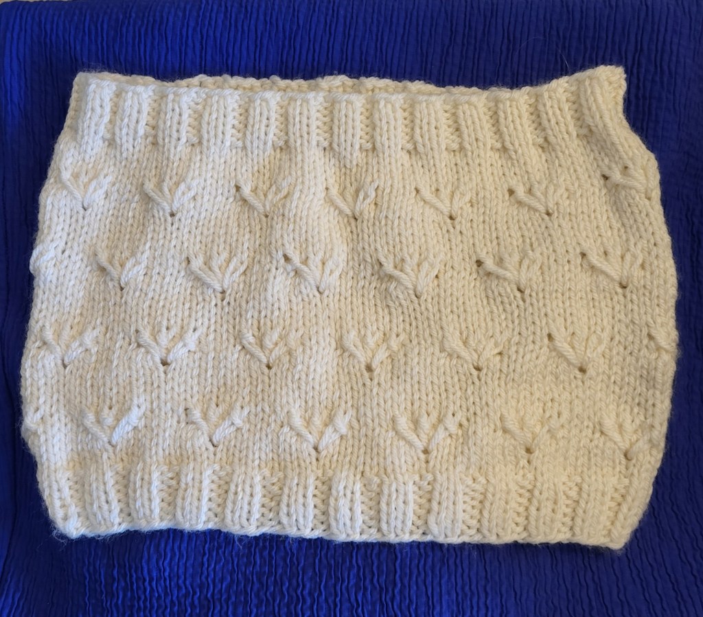 First is the cowl I finished for my son’s mother-in-law for Christmas. She and I exchange gifts every year and last year I made her a headband so her ears would be warm when she went walking and I wanted the cowl to match. I used the dandelion design from the headband pattern and designed where to put it, how many stitches to make the cowl, how many stitches before starting each pattern and between so the pattern ended up right at the end and staggering them. I’m not really a math person so it always takes me a while to design where to put designs, so I don’t do them very often. I had to frog this several times until I got the count and placement right.