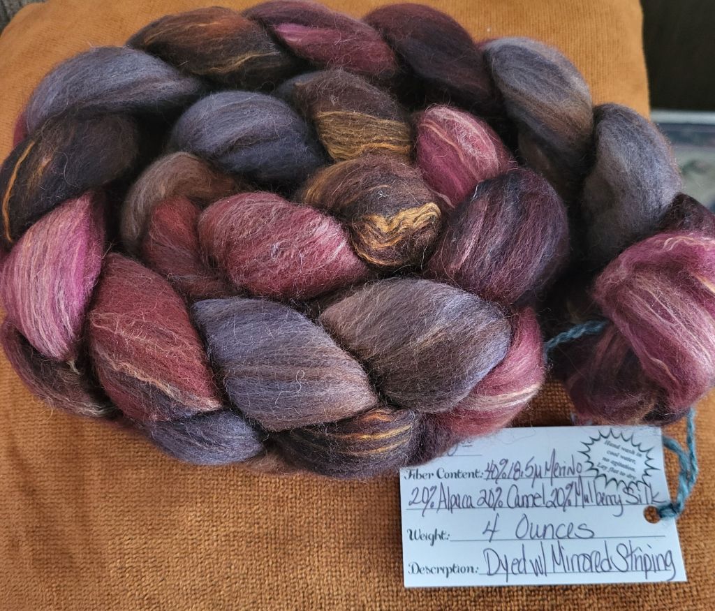 Next picture, this was the braid of fiber I bought, that I mentioned in an earlier post, that was so soft, Merino 18.5 microns (so soft!!!). It has Alpaca, Camel and Mulberry Silk and it’s like holding butter. Can hardly wait to spin this up!! Most Merino you buy is around 23 microns (that’s the fineness of the fiber, the lower the micron the softer), and that is still soft. I partly bought it because I knew all those fibers are amazingly soft and because I loved the colors on the braid.