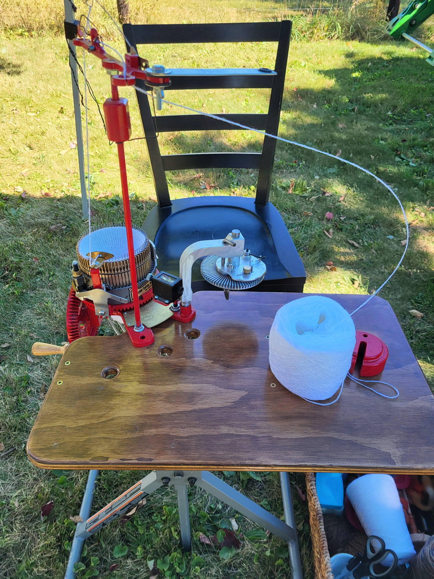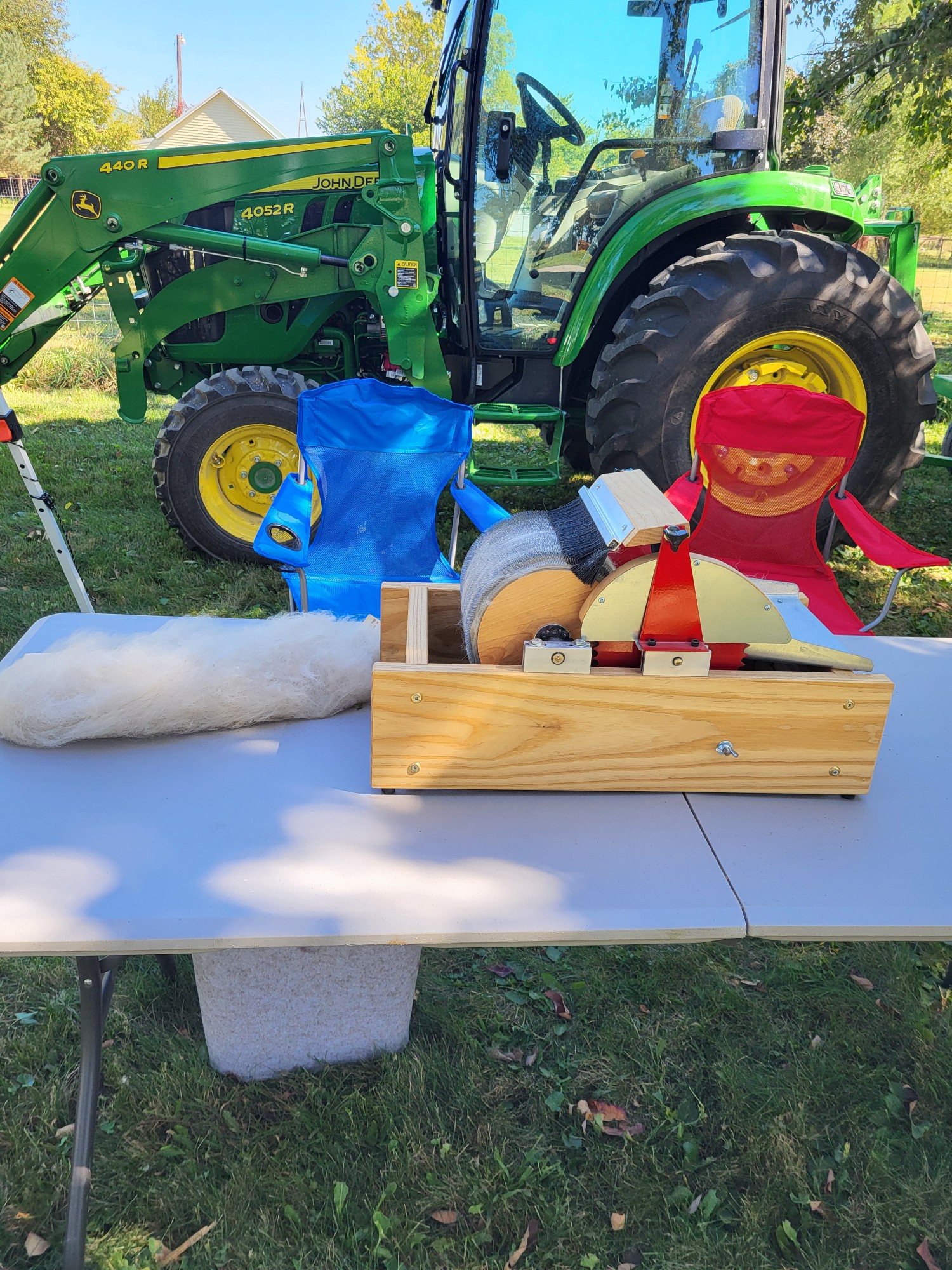 Ok, as promised :). The top pictures from left to right – The first picture is my son’s sock machine, it was rather windy – you can see the yarn blowing in the breeze, lol. He can whip out a pair of socks in about an hr, pretty cool huh? It’s made of metal and he lets the kids that come take turns turning the handle making a tube, they love it. Next picture is my spinning wheel, a Rick Reeves double drive wheel. It’s the smallest of my two wheels and will actually fit in the back seat of my car. My Kromski Polonaise is much bigger and would have to be taken apart to travel in my car, and nope not gonna do that! I’m not as sharing with my wheel at the event, it’s not replaceable, lol. I spin and people watch and ask questions that I am very happy to answer about the alpaca fiber and the wheel and making yarn, I do let them feel the alpaca fiber :). That cria fiber spins like a dream!! The 3rd picture is my son’s drum carder that he makes batts with for the dryer balls he sells at his farm store. I have two and put lavender on them before they go in the dryer, makes my clothes smell nice :). Behind the drum carder you can see his little tractor, that makes it easier for all the farm stuff he and Ev have to attend to. The 4th picture is the skirting table he made so it would be easier for them to skirt the fleeces and let the dirt fall to the ground and behind that you can see the frame with seats he made and attached on the trailer (that he pulls with the tractor) for hay rack rides he does once a week, everyone seems to enjoy the ride and the fire pit making smores afterwards :). My son is very handy with making things. The bigger picture to the left are his pea fowl and a family member who came to help. The peacock is starting to color out on the feathers on his back and a little on his tail, but it will be another 2 years before he has full color on all his feathers. He already looks at himself in the mirror that my son set out for him, the peacock is a narcissist, lol. The next 3 pictures to the left are of some of his herd. I did cover up faces of two people who were there because I didn’t get to ask them if they minded being in my blog. The last of those 3 pictures is the newest cria that was born a month ago, they call him Wish, but his full name is Wish Upon a Star, because his mother’s name is Star. He’s a cutie.