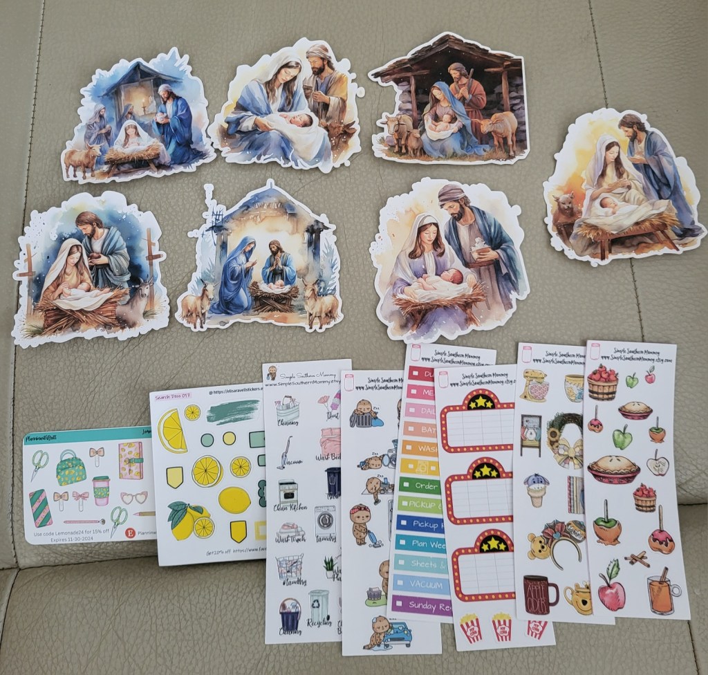 The next picture is of some Christmas die cut stickers. They will look good on wood to make Christmas tree decoration gifts. They are from SimpleSouthernMommy on Etsy, she even sent samples of some of her other designs :).
