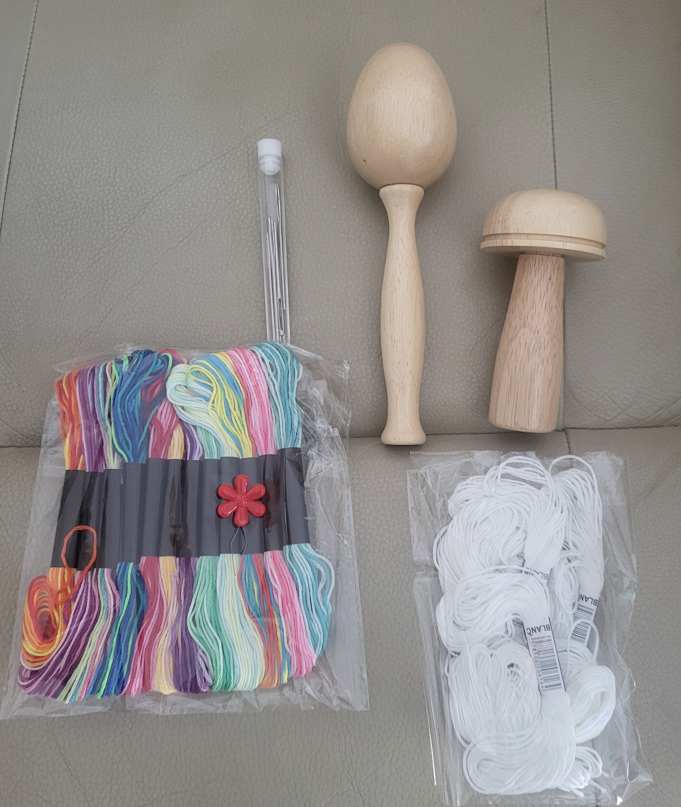 The last small picture is 4 pairs of alpaca socks from my son’s store, a little critter snuck into his store and chewed them up. He had to go through all his merchandise to make sure everything else was ok and he put out traps to catch the little bugger. He’s not had the problem before so he’s looking to see where it came in at. He told me if I could fix them I could have them, so I said sure and I ordered what’s in the 4th picture, a nice darning set. The little flower looking thing is a needle threader, how cool!!! I was watching Knitting Expat from YouTube on her Finishing Fridays podcast and thought I could do that, no telling what they will look like but they will be wearable and since it’s on the toes or heels, no one will see it. They are different sizes so I think I can fix two of them one for my son and one for his spouse and the other two I can wear one and give the other one so someone else who wears an XL (it’s one of the colorful ones) tho with the toes involved, maybe it won’t be XL after I mend it lol. They are very thick and soft!