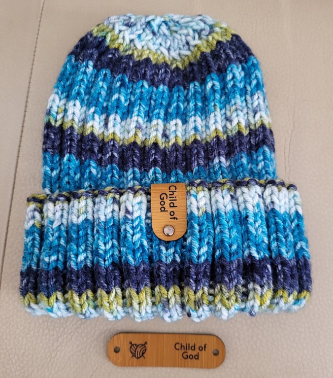 The last picture at the bottom is a hat with the new tags I ordered. I didn’t get leather because I was worried about how they would handle being washed and I wanted these to be easy care hats with a little something extra, so these are faux leather (a thick vinyl, lol) I chose the one that looked like bamboo. I think they look nice and everyone likes something nice. For the shelter I will make some with Child of God showing and some with the knitted heart showing so they have a choice. I think when I reorder I will get the ones I have to sew on instead of the snaps so they won’t come off in the washing machine. I’m a worry wort and I worry about everything, lol.