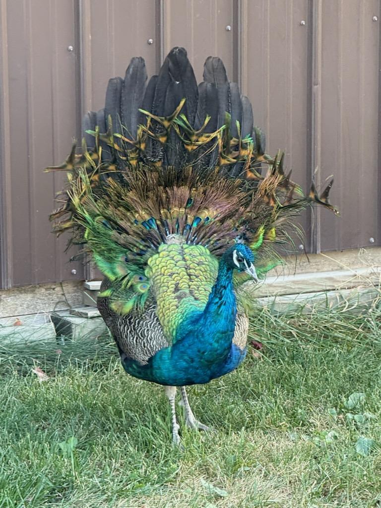 The last picture is of my son’s young peacock trying to strut his stuff, lol. He has about 2 more years before he has all his feathers in proper and they are in full color, in the mean time he’s practicing :). My son in law said he was trying to impress the hens, they couldn’t have cared less. LOL