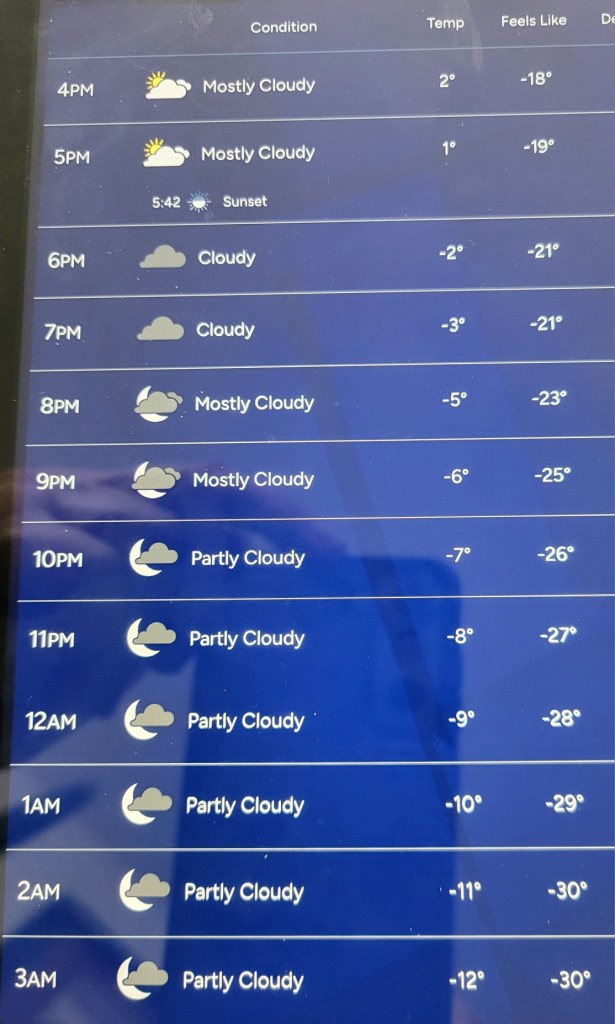 The 2nd picture is our weather from yesterday afternoon to 3am this morning. We were almost as cold today, but starting tomorrow we will be a few degrees warmer and by Friday we will actually hit the lower to middle teens (without wind chill). I have stayed in my house yesterday and today, not my favorite thing getting out in way below 0 degrees weather. They are promising us lower 40’s on Sunday and Monday, impatiently waiting! Spring is getting closer even if it doesn’t feel like it :P.