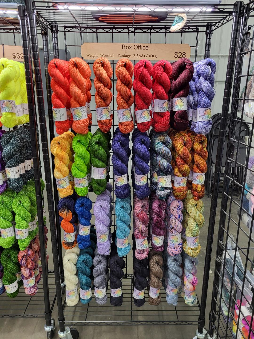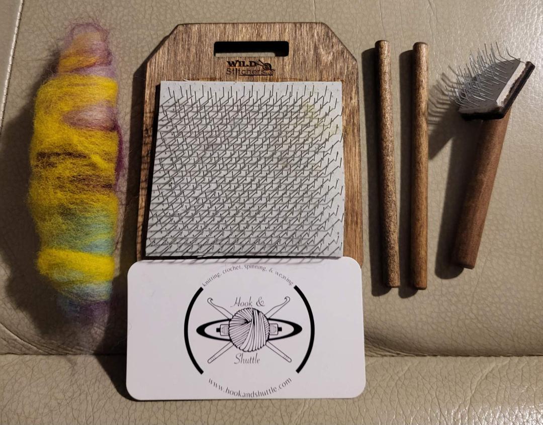 I did buy from 2 vendors, I didn’t get a picture loaded but I bought 2 lotions from the Lily’s soap and lotion vendor – two lotions, an almond & cherry fragrance and a lavender fragrance. Both are so good. The 1st picture above is of a miniature blending board that was so dang cute I couldn’t resist it, and the 2nd picture shows my attempt to make a mini batt and the rolag is in the 1st picture, LOL. Now I just need a little miniature spinning wheel to put in my craft room on the craft dresser with the miniature blending board. The business card is the vendor I bought this from and the creator is on the bag it came in. Those tines are sharp, I poked my thumb!!! The little brush looking thing is called a burnisher, it is used to comb the fiber deeper into the tines on the board and the two rods are used to roll the fiber up into a rolag. Would look so cute in a shadow box!!