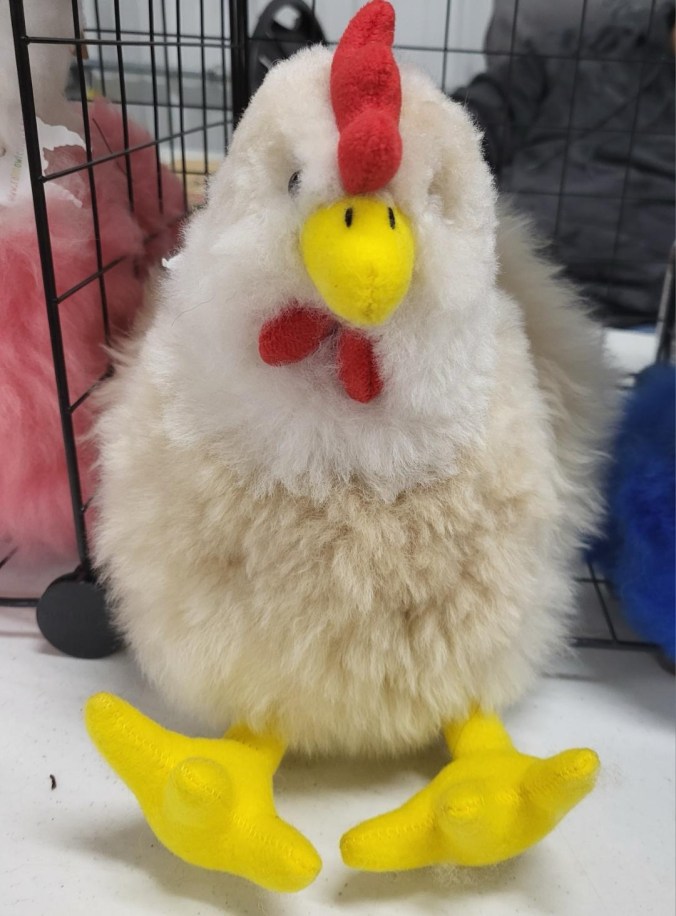These first pictures are my son’s fiber stand, the 1st picture is most of it. The 2nd one is some printed alpaca coins (so cute!) on the part of the table that doesn’t show. The 3rd picture is a very large toy alpaca with alpaca fur that he uses as his mascot on his table so people will know he sells alpaca yarn (people love to pet it), you can see 3 alpaca rugs behind it. The last picture is a close up of the printed yarn bowls (cat, puppy and alpaca) he makes along with some of his alpaca fur stuffed animals and some dryer balls, the Chicken is in my Monday funny :P. And oh, the little round things hanging on the side of the yarn bin, are bird nesting balls. He puts his less useable alpaca fiber to stuff in them for the birds to use for their nests, not much gets wasted!! Hopefully clicking on the pictures will enlarge them.