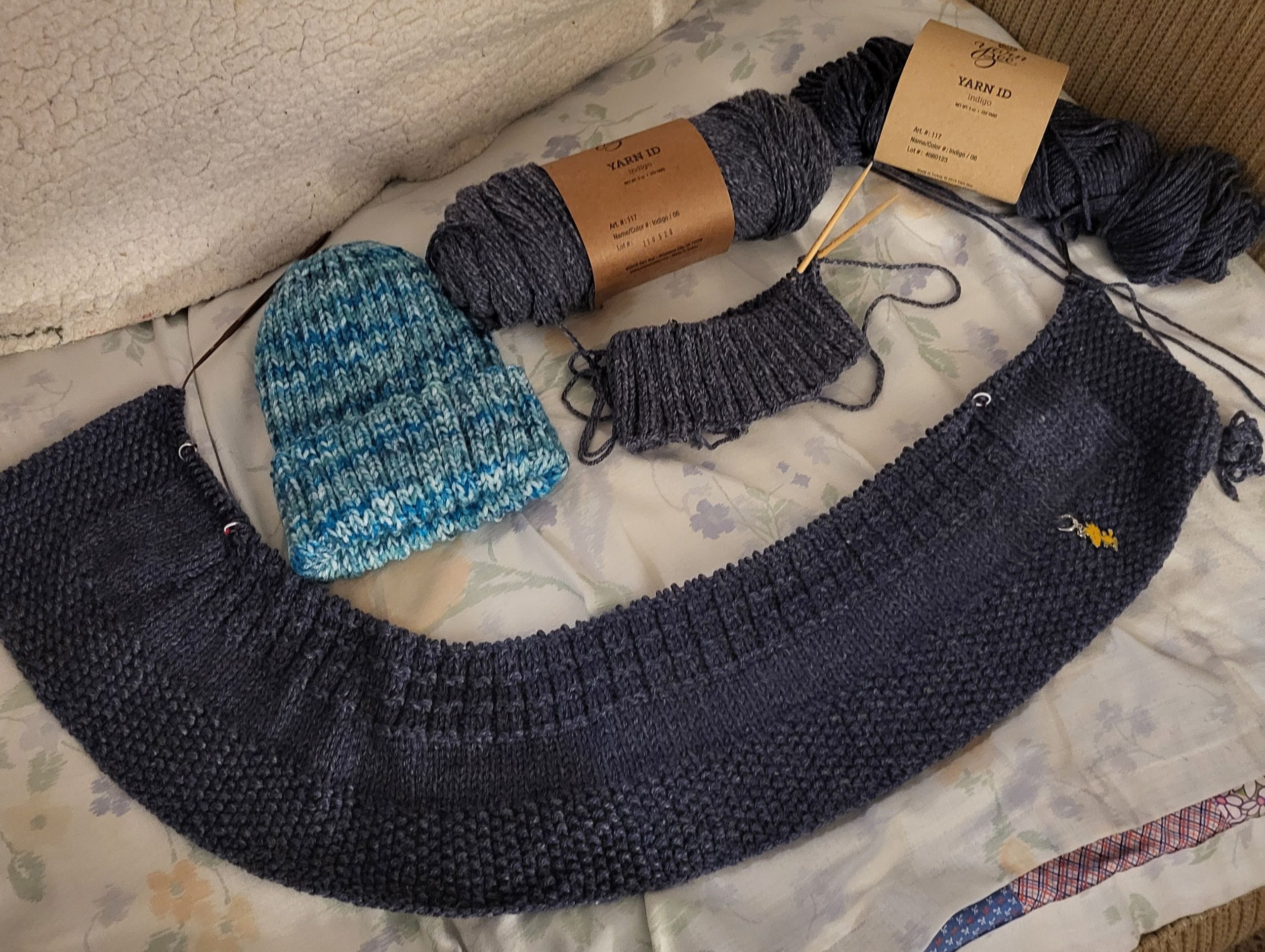 Time for a knitting update. Picture one – (if you click on the picture it will enlarge) I have been working on my Hats for Warmth project so I will have hats for the homeless shelter this fall, gotta get a head start on it :P. The finished one is from I Love This Yarn from Hobby Lobby, color Deep Sea Diving/842. The one next to it is still from Hobby Lobby but it’s their Yarn ID, color Indigo, it looks like a denim. Really pretty. I am also using that same yarn and color for a new Look for Happiness Blanket. I really like the softness of this yarn. I love this pattern and find it extremely comforting and peaceful to knit. It is for a Christmas gift and since it’s the medium size instead of the baby size, it will take about 6 skeins, I decided I needed to start early, but to be honest, I don’t mind knitting on it all year long at all.