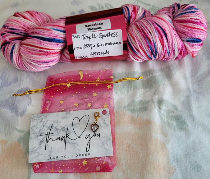 Well I might have accidentally ordered a skein of yarn from an Indy (spelling?) dyer on YouTube that I follow, Awenydd Yarn and Fiber, I linked her shop, you can look for her on YouTube under that name. She does a Monday podcast reworking some of her older color ways while you watch her dye, a Wednesday podcast while you watch her dye from a random selection of colors of dyes from a random generator, it’s fun, and on Fridays she talks about her works in progress etc. This was one of her reworks of an older color way, she did last week, to jazz it up a bit. I fell in love with it, I had enough extra money and ordered it. She got it right out to me and she sent me that beautiful crystal in a heart cage progress keeper as a thank you, so pretty. I’m thinking about asking her to dye up a skein of just the blue color as a tonal next month. I thought it would make a nice shawl knitting 6 rows of the blue and 3 or of the American Woman rows throughout the shawl. What do you think? I think the blue would give it some balance and depth as a shawl, beginning and ending with the blue, and the brighter colors would make it pop a bit adding excitement and the blue in the brighter colors would pull the two together :). If I was a sock knitter I would just knit socks for July, but I’m not, so there’s that :P. She has knit samples with the skeins so you can see what the yarn works up as.