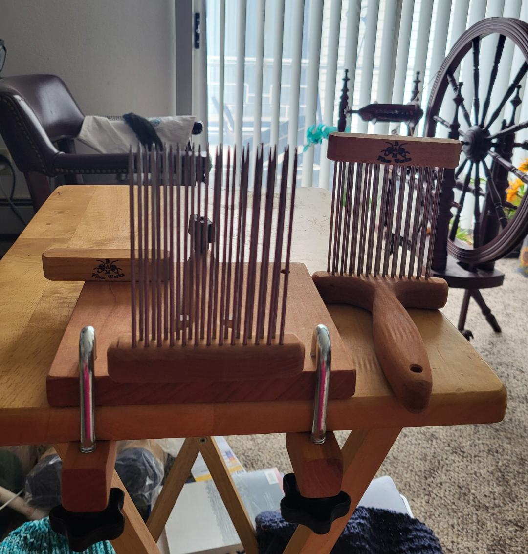 Ok, I hemmed and hawed and decided to buy a set of wool combs from Bam Fiber Works . I got the double row, fine wool combs with a magnetic comb cover. LOL so glad I got those covers, these things look like weapons!!! It came with a bottom that you can clamp to a table and had a nice set up to hold the comb still while you use the other comb to comb through the fiber and align it and and clean it from short cuts and left over vm. I will be washing some of the 2nd cuts from the cria (baby alpaca) fiber I got so I can try it out. Gotta be careful using those, they can do some damage!! These combs are very nice, I will enjoy learning to use them (carefully!!)