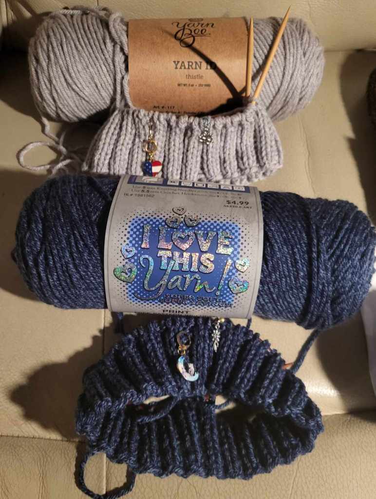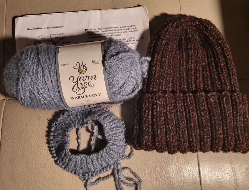 I started the baby sweater (in the 1st picture in the light blue, Spa color way) in Yarn Bee Warm & Cozy yarn a few weeks ago, but had to frog it and start again. Been a while since I’ve done the Tin Can Knits Flax sweater pattern. Plus I decided to do a cable on the sleeves instead of the garter stitch. I have the neck done and the stitch markers in to mark off the front, back and sleeves. Just started the increases for the raglan part. I will be working on it soon, it needs to be done in February.