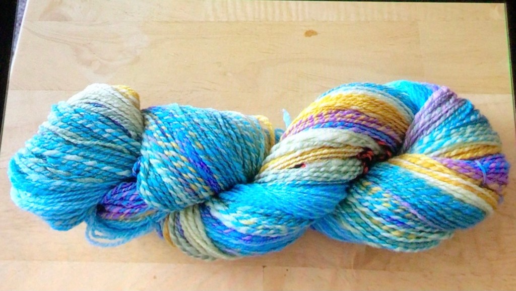 I barely got it on the bobbin, had a little left over on one bobbin, more practice with chain plying :P. This is either a heavy worsted or light bulky, will see when it’s dry. 🙂