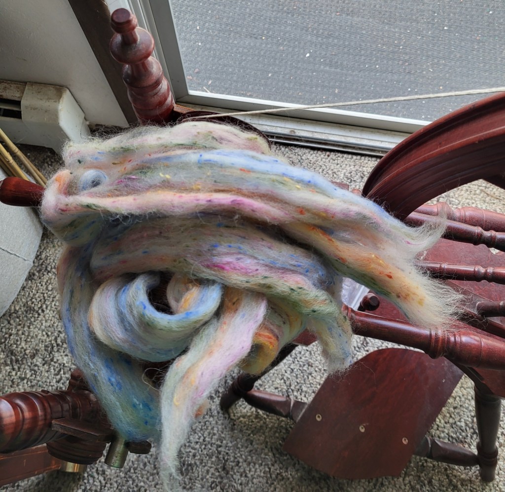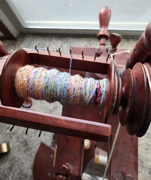 The next picture is a wip spinning project, this fiber is Pop Rox from Camaj Fiber Arts. Almost done with the first bobbin. I thought maybe I would spin all of it on one bobbin and then chain ply but I don’t think I will be able to get the other half on there. On the side of the bobbin, I laid out the rest of this half of the fiber for you to see, then I have another bobbins worth. So I will go ahead and make this a fractal spin, it’s going to my eye dr, who is a knitter, for her daughter a hat. 🙂
