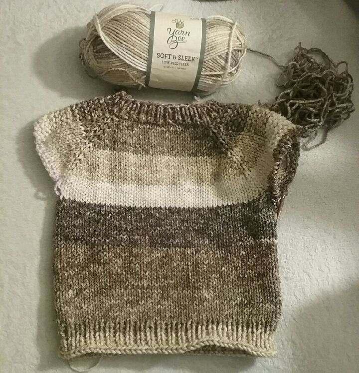 Finally I have started another baby sweater using Hobby Lobby, Yarn Bee, Soft and Sleek, in Neutral Stripe and a Knitters Pride Karbonz size 5 needle 16″ for the neck and ChaoGoo size 5 needle 9″ for the cuffs and KnitPiks Radiant (wooden) needle size 7 16″ for the body and ChaoGoo Bamboo size 7 needle 9″ for the sleeves. After I get past the yoke the body and sleeves are mindless knitting too. There must be a theme here!